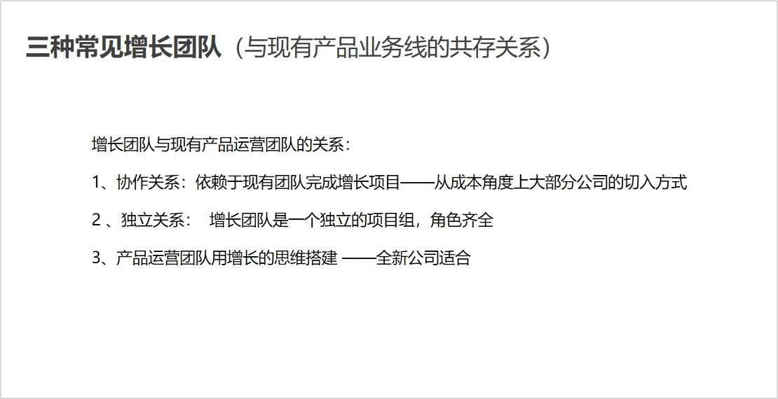 第三种是公司所有的产品研发设计的线条都以增长的理念思路来搭建和架构的。这种在国内比较难于实施,除非全新公司,否则会对现有公司组织体系做很大调整。但我觉得这是将来比较好的一个完全体,因为增长应该是贯穿到整个公司的理念。