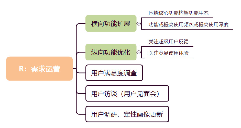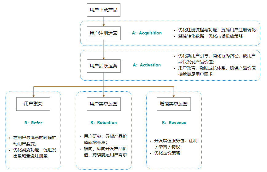在“土味”中,原来的AARRR五步逐层漏斗被我改造成了”A””A””RRR”三步漏斗,个人认为“RRR”的工作部分是相对独立的,应平行来看。