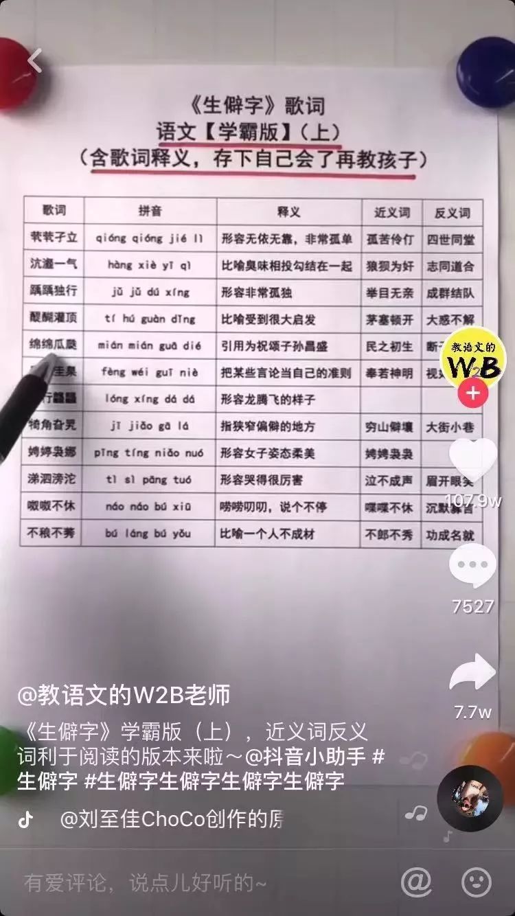 比如,在歌曲《生僻字》大热时期,“教语文的W2B老师”就将其和语文结合,教授歌曲中生僻字的具体写法,又通过歌曲的形式进行语文知识的输出,节奏轻快,为账号带来许多流量。