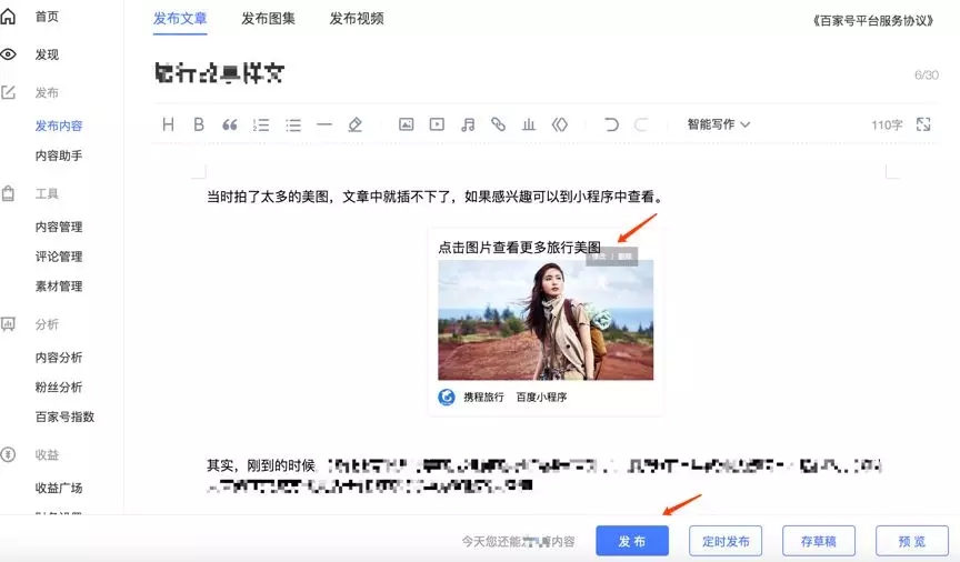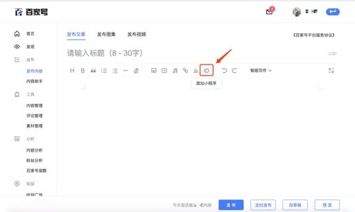 3)进入百家号后台(文章发布页面),编辑文章并选择需要挂载的小程序