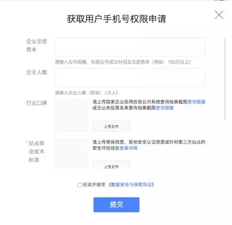 注:需提供等保资质(安全等级需在2级以上包含2级),或第三方站点的安全评估报告。需提供原件或复印件加盖公章。若是医疗或金融行业,目前暂不支持申请。