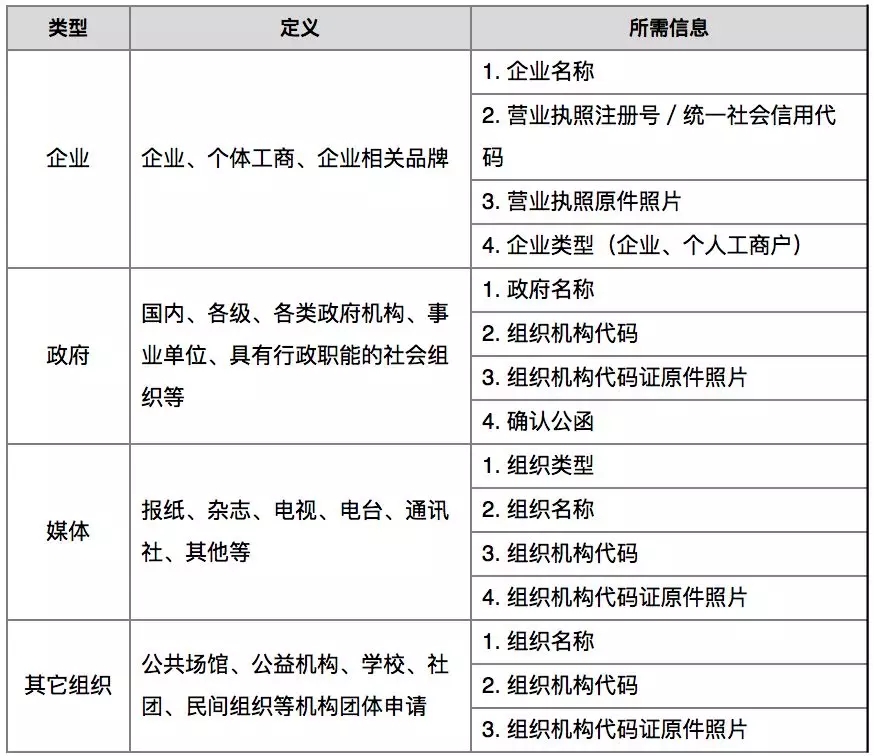 A:媒体、企业、政府、其他组织四种主体类型。不支持个人开发者。