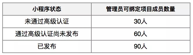 A:登录智能小程序平台,进入平台首页- 成员管理,添加智能小程序项目成员并配置成员权限,一个智能小程序只能添加一名管理员。小程序处在不同的状态,可绑定的项目成员数量不同,具体内容如下表: