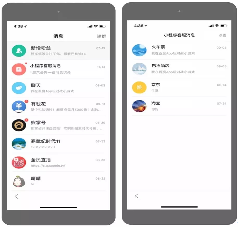 6、消息展示:目前百度智能小程序消息通知不上通知栏,展示路径为:百度APP“消息中心”的“小程序客服消息”聚合卡内。