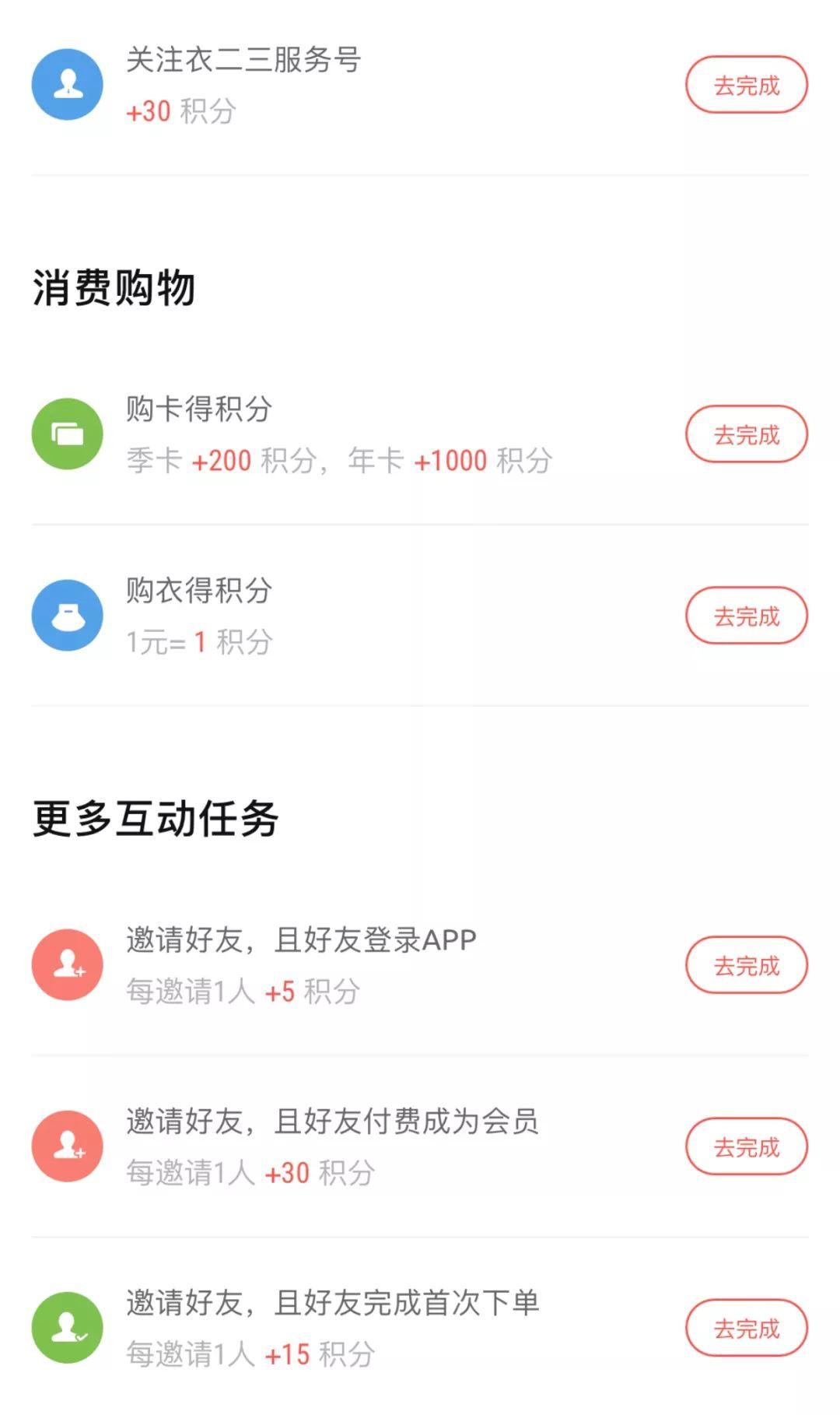 以衣二三平台为案例,可以看到平台共计将获取积分分为20个步骤,这些积分的用户行为,都可以让平台清晰的了解到用户的消费潜质,比如说绑定淘宝,轻松了解到用户的芝麻信用,填写个人尺码,了解到用户的身材比例数据,填写风格偏好,了解用户的穿着喜好等。