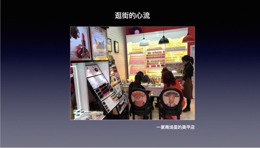 然后我们就去看这些用户平时的场景和她们的心理,发现这些用户会把美甲当成逛街的一部分,她们不会单独把美甲抽出来说,我的手指甲现在不好看了,我想要做个什么效果之类。