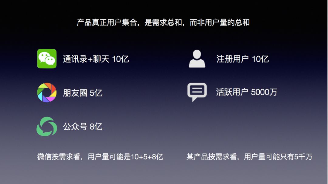 比如说我们说,微信它有10亿的用户。但是我们把它的功能或者满足的需求拆开看,它的通讯录和聊天是一类用户,它的朋友圈,可能有5亿用户在用;它的公众号,可能有8亿的用户在用。那么实际上对于微信来说,它掌握的是23亿用户的需求。虽然,它的用户量还是10亿。