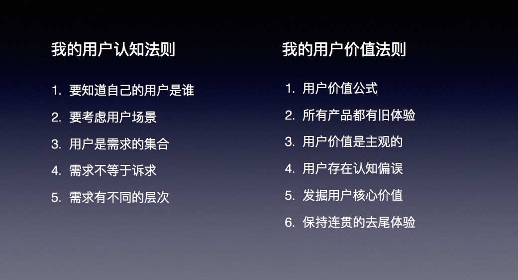 所以,我们回顾一下,第一个就是怎么去认知用户,我的认识用户的法则,就是这五条。