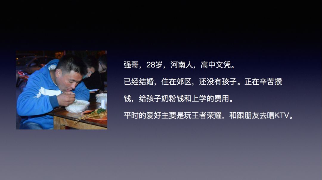 中间的这个,是强哥,28岁,是一个河南人,然后他是高中文凭。他住在郊区,他已经结婚了,现在还没有孩子,但是正在攒钱,准备养一个孩子。平时的爱好就是玩网络游戏,玩手游或者跟朋友去唱KTV!