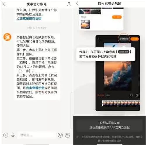 7月19日,有消息称,快手App正在小范围内测长视频功能,时长限制在57秒以上,10分钟以内。在此之前,普通用户最长只能录制11~57秒的短视频。虽然目前该功能为测试功能,仅部分用户可以体验,但后续快手可能会将此权限放开。