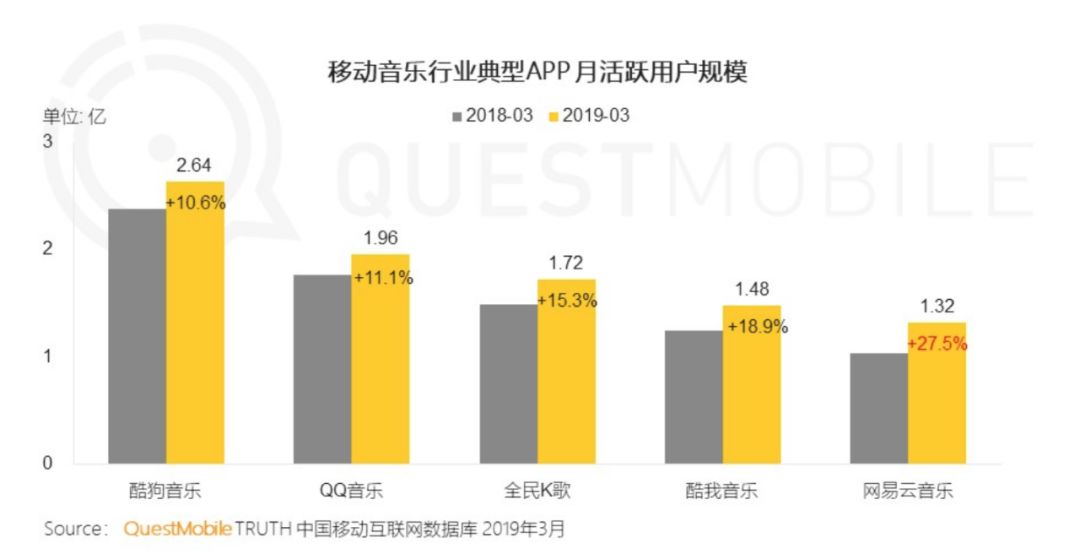 据Questmobile数据来看,当前国内音乐App MAU(日活)过亿的产品是: