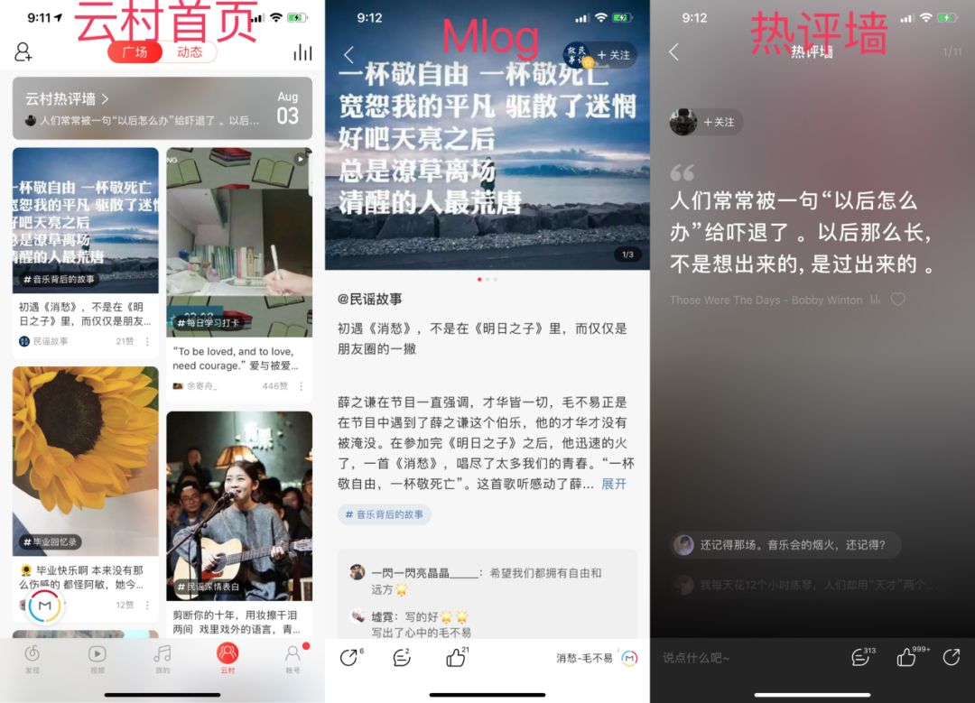 自左到右:云村首页、Mlog、热评墙