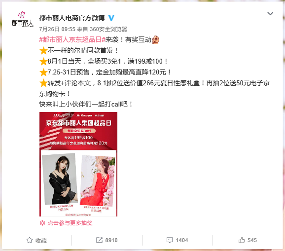 各大品牌鼎力支持,美妆品牌、韩都丽舍等蓝V转发,目标消费者相互打通,蹭热度的同时,潜移默化的把一类人聚集在一个小岛,让爱美的女孩都8月1日上岛购物。