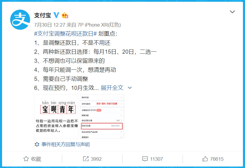 用户现在即可开始预约,到9月时花呗官方会确认是否预约成功,并进行统一修改设置。7月30号中午,支付宝官方微博第一时间证实了这一消息,还特意为“宝呗青年”划好了重点。