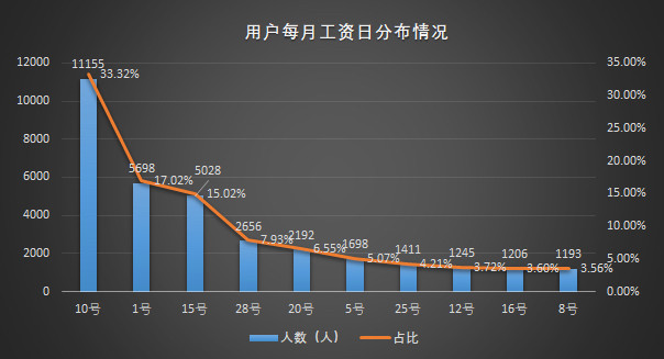如下图所示,本次分析共收集了3万+用户的工资日数据,其中人数最为集中的TOP10工资日分别是:10号、1号、15号、28号、20号、5号、25号、12号、16号、8号。