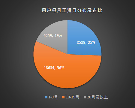 根据具体日期再进一步合并分析,每月1-9号发工资的人数为8589人,占比25%;每月10-19号发薪的人数最多,18634人占比高达56%;每月20号及以后发薪的为6259人,占比19%。