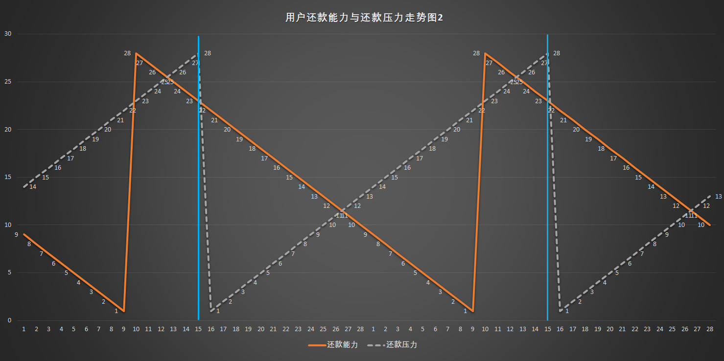 如走势图1所示,这是一个9号还款日、10号工资日用户的“还款能力与还款压力”变化走势图。