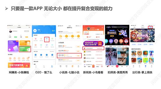 我们从下图可以看到现在有许多APP都开始做复合变现了,那么这个究竟怎么做呢,其实本质就是思考你的用户是谁,他们除了你现在提供的服务以外,还需要什么服务,你能不能在产品中毫无违和感的添加进去。