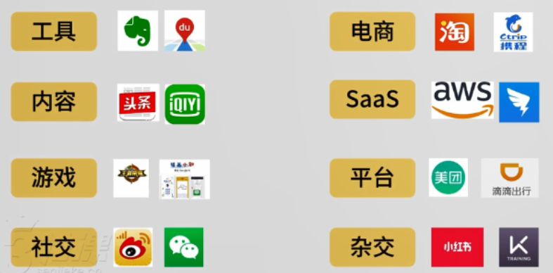 市面上的产品大致可以分为8类:工具,内容,游戏,社交,电商,SaaS,平台,杂交(具有多种属性)