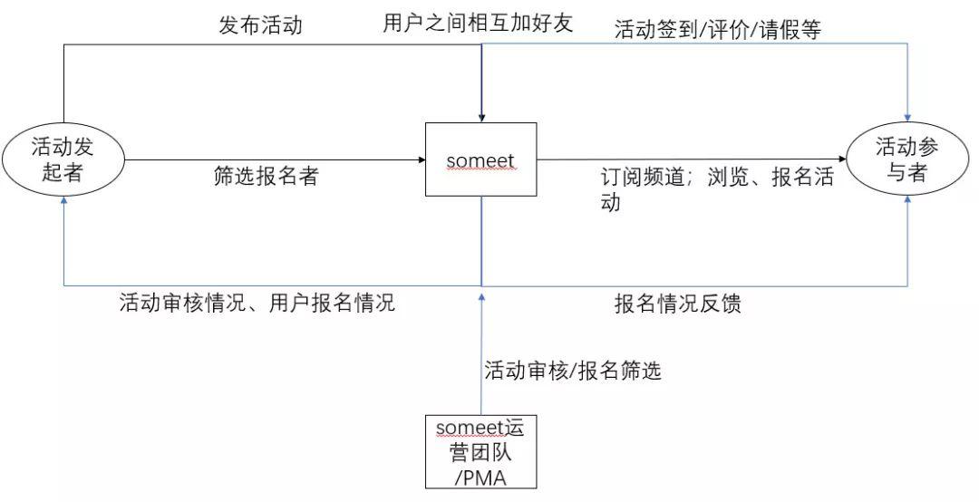 Someet的核心是用户发起活动,其他用户参与互动,活动发起者和活动参与者之间是相互筛选的过程。