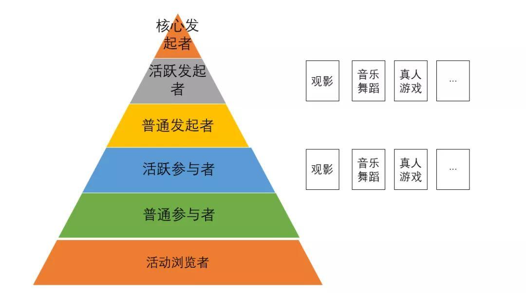 其中活动参与者可以按照参与次数、浏览、订阅等情况初步划分,而活动发起者按照发起活动次数分层。活动发起者层级高,位于金字塔上方,活动参与者位于下方。差异化运营不同层级用户。