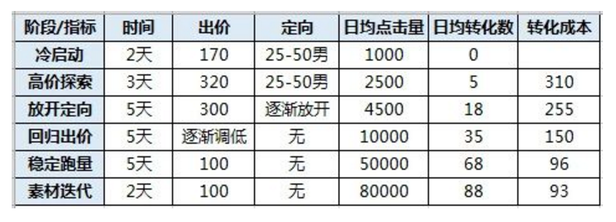 并且遵循着高价优先探索优质流量(定向),再逐渐放开定向,调低出价的方法,称之为“扩散式投放”,最终达到了广告主的预期。