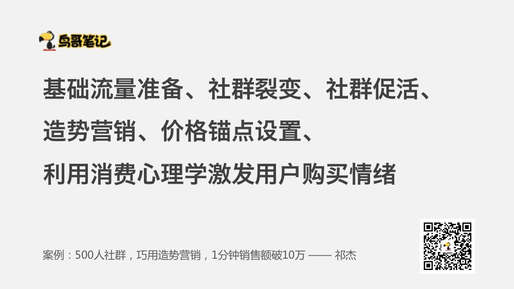 这次活动之所以能够获得成功,其实并不是靠一个单一的方法来支撑的,我使用了的具体的方法包含:基础流量准备、社群裂变、社群促活、造势营销、价格锚点设置、利用消费心理学激发用户购买情绪。