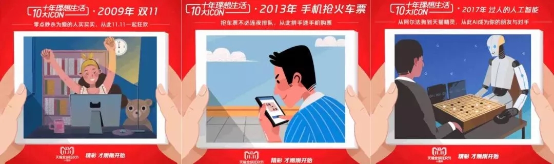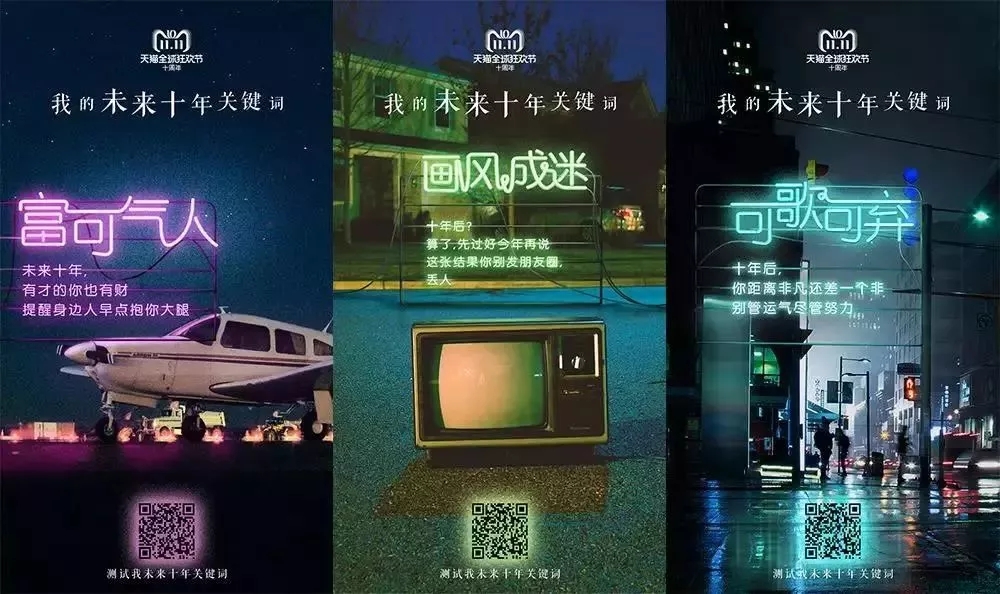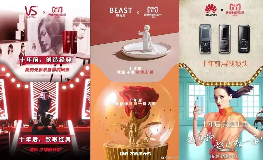 打情怀卖点一直是屡试不爽的营销方式。今年正值天猫双11十周年,天猫立足于十年这个意义重大的节点,把单纯的促销式营销变成了时间加持下的情感营销,从双 11 的十年延伸到了以个体和时代为中心的十年。