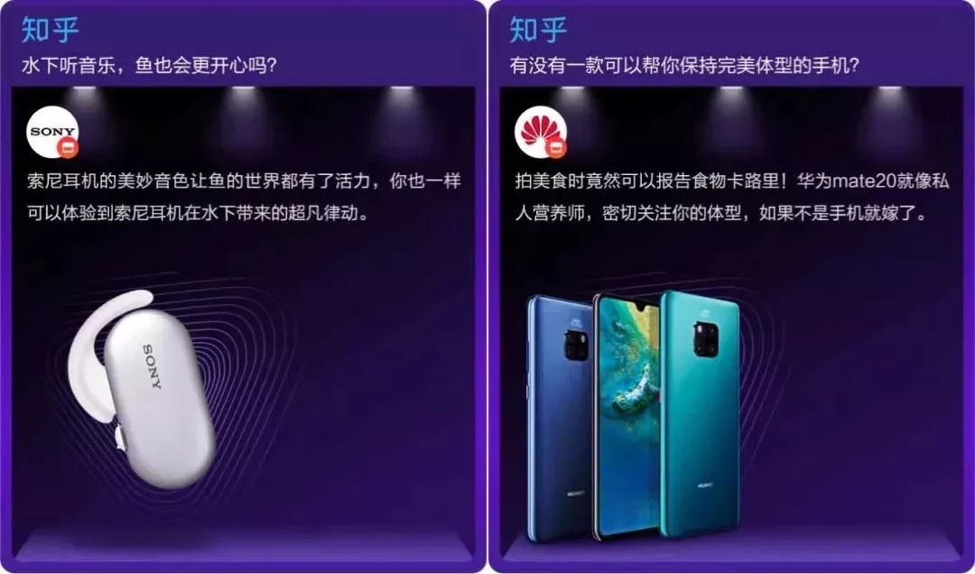 不同于罗列产品特点的传统广告形式,「新知妙想 +」通过知乎专业优质内容的解析,将产品塑造成现货又深度的形象,例如通过对鱼进行声音测试自然引出索尼新款耳机的防水音效好的特点、通过测试卡路里的形式引出华为 Mate20 不仅让照片效果好更有又能自带食物的卡路里识别功能。