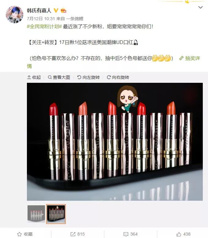 与其5支口红送5个人,不如5个色号都送给1个人。这样一来增加了话题性,让粉丝有话可说,有事可聊。通过巧妙的优化抽奖博文,增加评论互动,降低转发门槛,让更多真实用户参与,还能增加其人设特色:一个自己做老板的女美妆博主,不就应该任性吗?你看,5支送一人,效果比5个人一人一支还好。