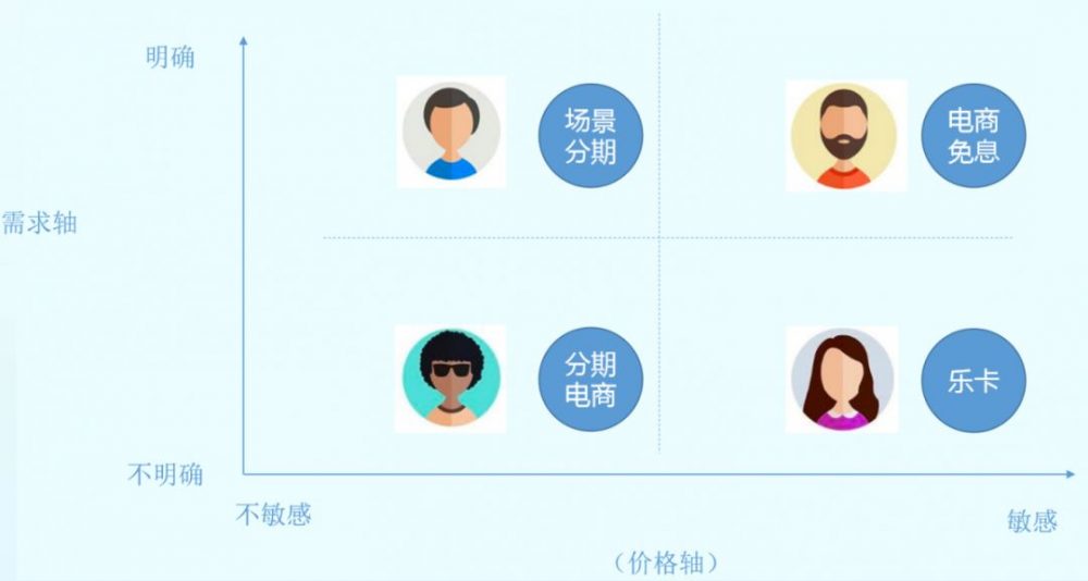 在这个视窗模型里面,纵坐标代表的是用户需求,横坐标代表的是价格(价值),根据用户需求明确程度与价格敏感程度的不同组合,在结合场景的基础上,把用户分成了四种不同的类型,并且针对这四类用户分别提供不同的服务:场景分期、电商免息、分期电商和乐卡。