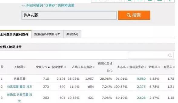 从图片中可以看出,仿真花藤这个类目词,刚好可以作为我们的突破性关键词,搜索人气、转化率和竞争度都基本上符合要求。