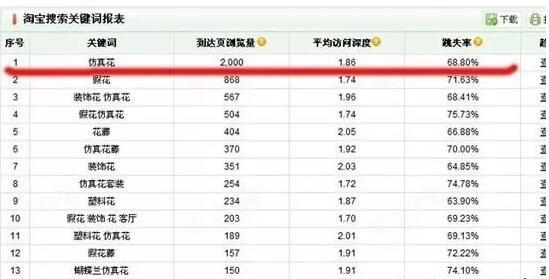 在上图中可以看出,仿真花的搜索人气、访问深度和跳失率都是表现不错的,所以这个关键词就是店铺的核心关键词。