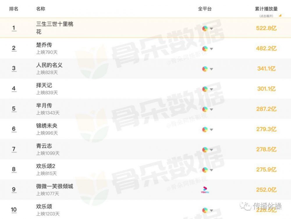 相比之下,神秘网站YouTube上播放次数最高的一支视频仅只有63亿,YouTube中top10视频加起来也敌不过一部《三生三世十里桃花》。