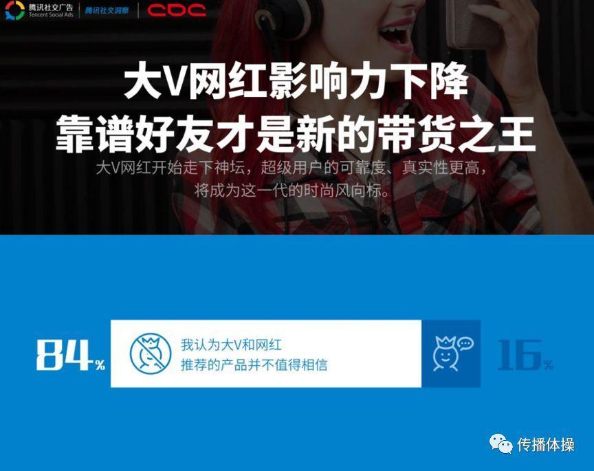 典型例子是网生一代的00后,在腾讯发布的《00后研究报告》中显示,84%的00后受访用户认为网红大V推荐的产品并不值得相信。