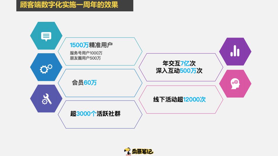 这是西贝整体的架构,从上有统一的组织机构管控、会员服务、社区运营部、数字技术部、下面有各种各样的部门各司其职。这是它最终的数据,效果非常好,在2016-2017年裂变非常容易做的情况下,长势喜人,可以深入互动500多万次。