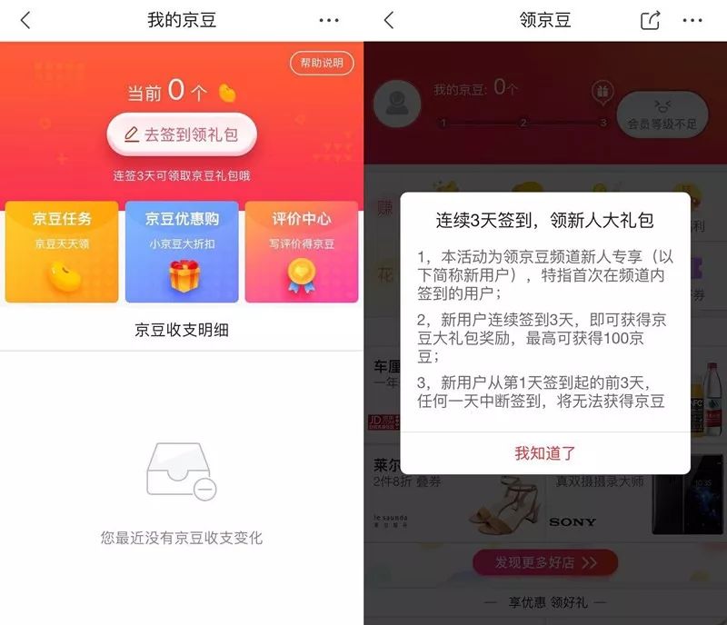 连续签到3天可以获得100个京豆,100个京豆可以帮助用户购换商品,流量等。长期做下去,不仅可以提高用户活跃度,还可以起到留存的作用。