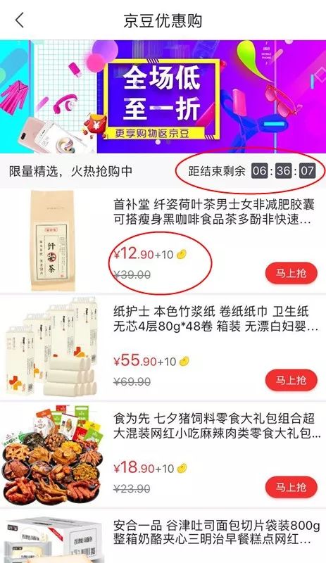 用户在打开“优惠购”时会看到,原价39元的一个减肥茶,现在只需要12.9元加10个京豆就可以购得。