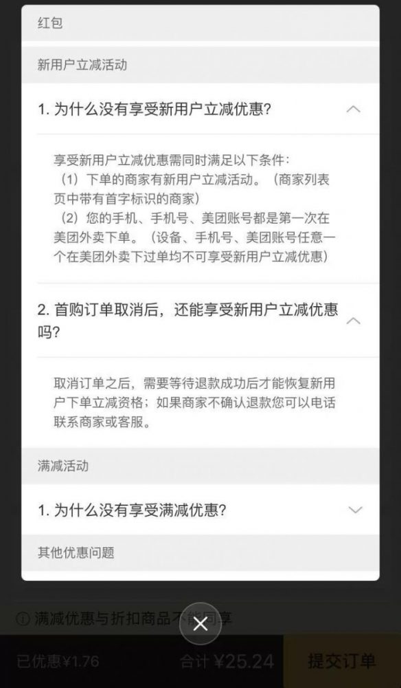 不过要提示的是,美团外卖会设计一些规则,比如“一个手机号对应一个用户只享受一次优惠”,“不是每个入驻美团的商家都会推出新用户立减活动”等。