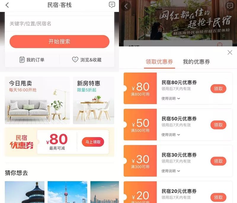 当用户首次进入“携程民宿页面”,可以领取优惠券。用户在付款预定民宿时,可以使用优惠券抵扣房费。
