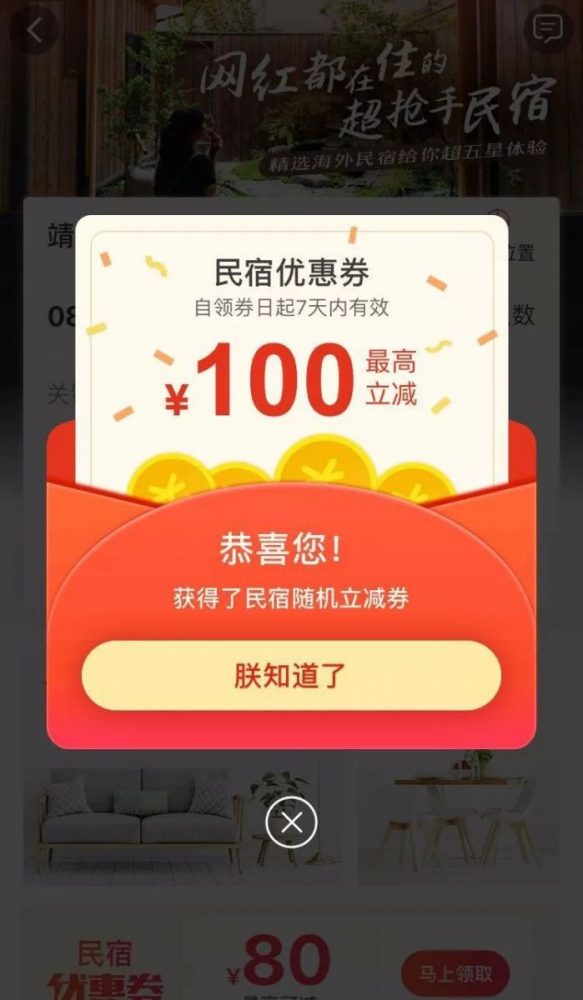 首次注册使用携程民宿的用户也会获得平台随机提供的“最高可减XXX元的民宿优惠券”