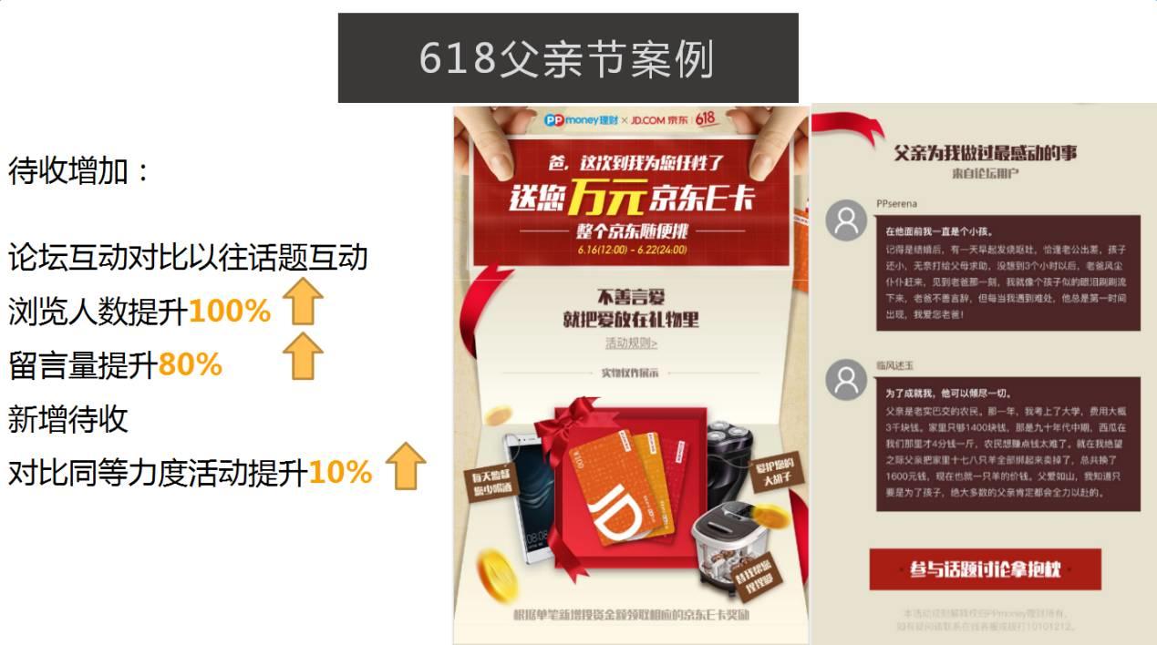 首先,我们抱了“京东6·18”的大腿,他铺天盖地的广告,我们就告诉用户可以免费拿京东E卡还能享受京东的大优惠!那传递给用户的投资场景是什么呢?你获得京东E卡可以为您的父亲买礼物,对于不善言爱的中国人,把爱放在礼物里来表达最好不过了。再加上论坛话题互动“父亲为我做过最感动的事情”,让用户抒发自己对父亲的情感,对活动参与再做一层引导。整个活动就是让用户感觉他是在做一件送礼物给爸爸的事情,而且不用花钱就能享受京东大促。触达给用户的利益点越多,越能打动用户。