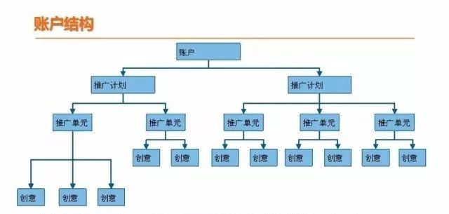 百度的账户结构可按照4个层级进行划分,由上至下分别为:账户层级、推广计划、推广单元,单元下面包含关键词和推广创意。