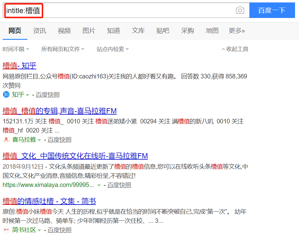 直接搜索会匹配到内文中有相关信息的词条,效率不高。标题是对内容的归纳,如果想在网页标题中搜索限定关键词,可以在需要检索的信息前输入“intitle:”前缀,直接定位标题关键词。