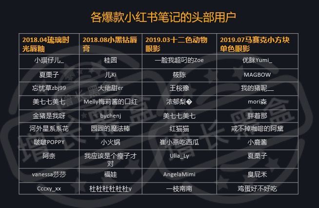 另外,我们又通过爆款的商品找到当时写过小红书笔记的头部用户(此处展示部分)