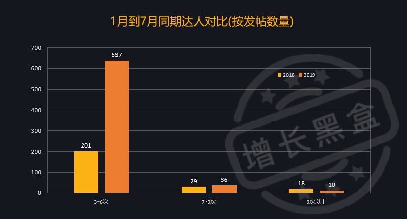 横向对比这些KOL,我们发现一个规律:完美日记可能更倾向于广泛的进行投放,大部分KOL与完美日记的合作次数都在3-6次,而少量高价值的KOL会反复投放。可以看到,2018年到2019年的增量部分的KOL也是集中在3-6次合作区间。