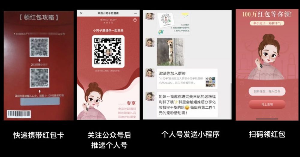 首先,其建立私域流量的目的并不是用来获取新用户的,而是想办法留住已经购买过产品的老用户。从流程上我们就可以看出来: 1. 购买完美日记的产品后,随包裹附送一张“红包卡”,刮开图层可获得特殊口令2. 扫码关注公众号3. 公众号立刻推送一个页面,包含个人号二维码4. 添加个人号后收到一个小程序二维码5. 扫码并输入口令,即可领1-2元红包