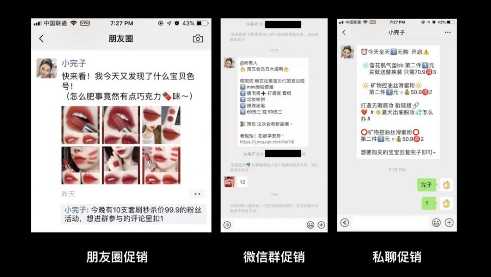 其次是朋友圈。大家一定很好奇,为什么完美日记要用“小完子”来统一所有的微信号?原因很简单,就是通过打造人设,让用户产生信任。当你首次添加微信号时,“小完子”的第一句话就是:“我真的不是机器人!”。而不论是小程序和朋友圈,“小完子”都是真人出镜,让大家看到了一个有血有肉的妹子,你的“私人美妆顾问”。 “小完子”不但会在朋友圈中发布各种日常自拍,还有新产品发布、抽奖活动等等,很大程度上影响了用户的购买决策。 我这里就引用一位老朋友、女性市场营销专家Doris的一段话来形容: