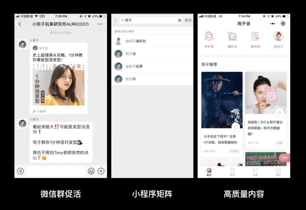 当然,完美日记的运营策略还没结束。把用户拉进自己的”私域“里,只完成了第一步,后续还需要持续不断的运营,才能起到留存的目的。基于个人号,完美日记的运营方向主要有两个: 首先是微信群。在第一步添加”小完子“后,用户就会收到加群的邀请,统一命名为”小完子玩美研究所“ - 这样就生成了数千个微信群。我们发现,其微信群的运营实际上是围绕多个小程序来进行的。通过”小完子“这个人设,打造出高质量的美妆内容,每天发布到小程序上,然后再转发到群里,引发用户持续关注和讨论。直播、抽奖等活动也会不断发布到群里。另外,各种用户调研、市场调研也可以在群里进行,极大方便了产品自身的迭代优化。