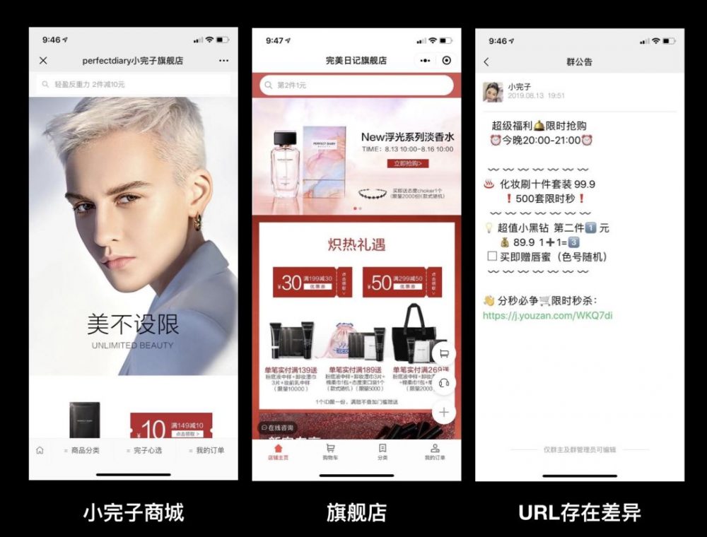 而由于微信和天猫无法互通,其购买渠道是通过有赞商城来完成的。但值得注意的是,社群中推送的购买链接,并不是引导到完美日记的官方旗舰店,而是到“小完子旗舰店”下单。更重要的是,我们发现每个群(群主是不同的小完子微信号)推送的商品链接中,均附带不同的UTM代码。这可能说明,每个账号背后的运营人员,都背了一定的销售KPI,而UTM正是用来追踪他们的业绩。